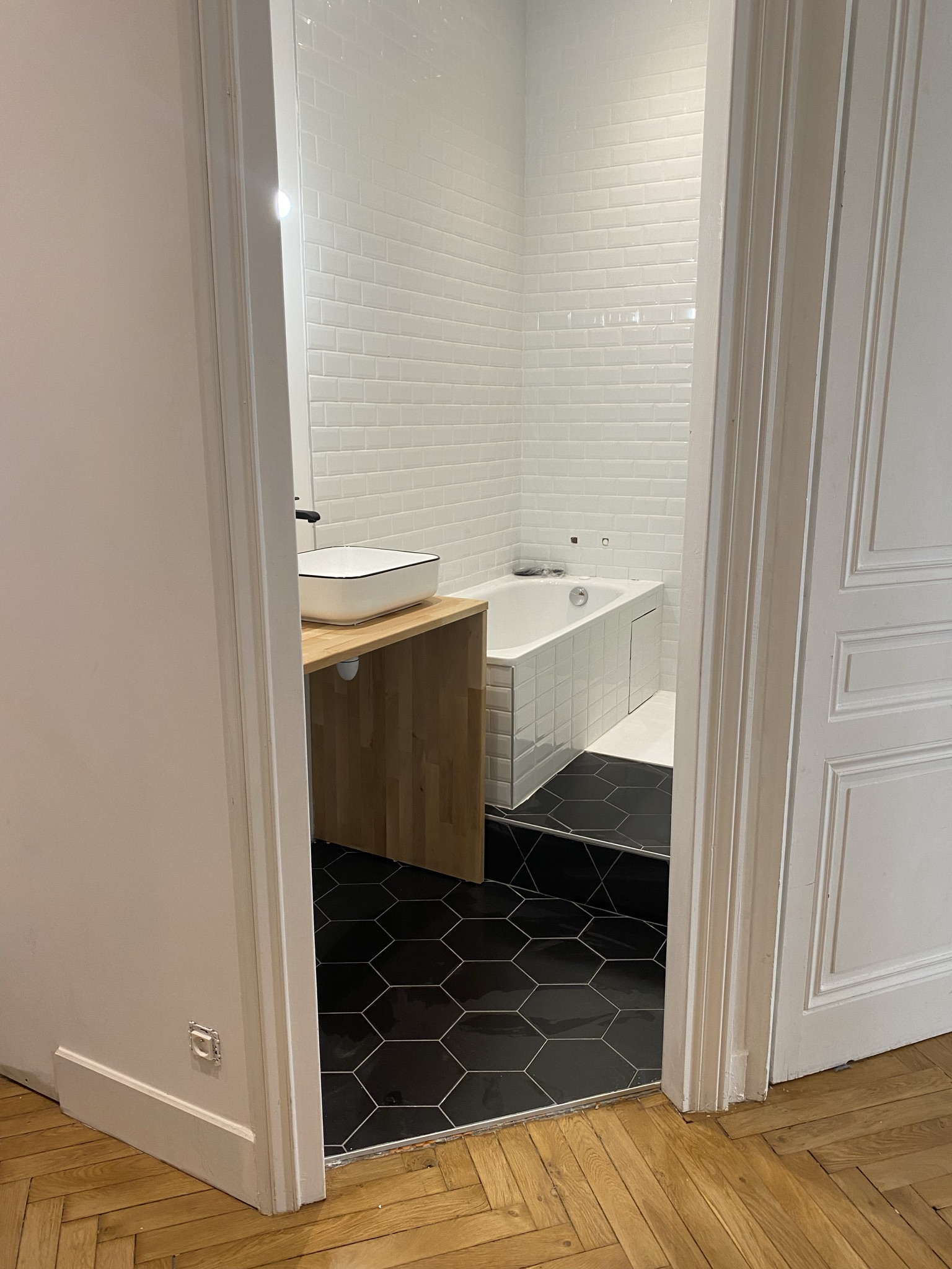 Un soin particulier a été apporté aux détails architecturaux : création de stylobath, réalisation de moulures au plafond dans les règles de l’art, et mise en valeur des matériaux existants. Ce projet illustre une approche mesurée de la rénovation, où chaque intervention vient souligner l’architecture existante sans jamais la dénaturer.