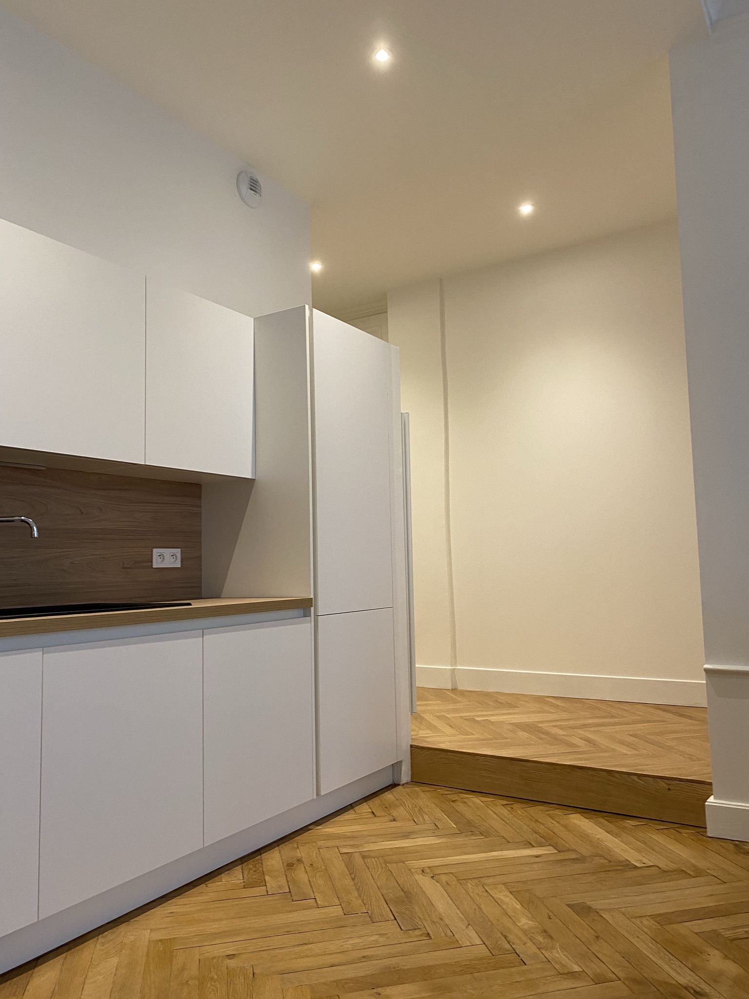La redistribution complète des espaces a nécessité des interventions techniques précises, notamment la création d’une estrade permettant le passage des réseaux. Cette solution a rendu possible le déplacement de la cuisine et de la salle de bain, tout en préservant l’équilibre et l’élégance des volumes.